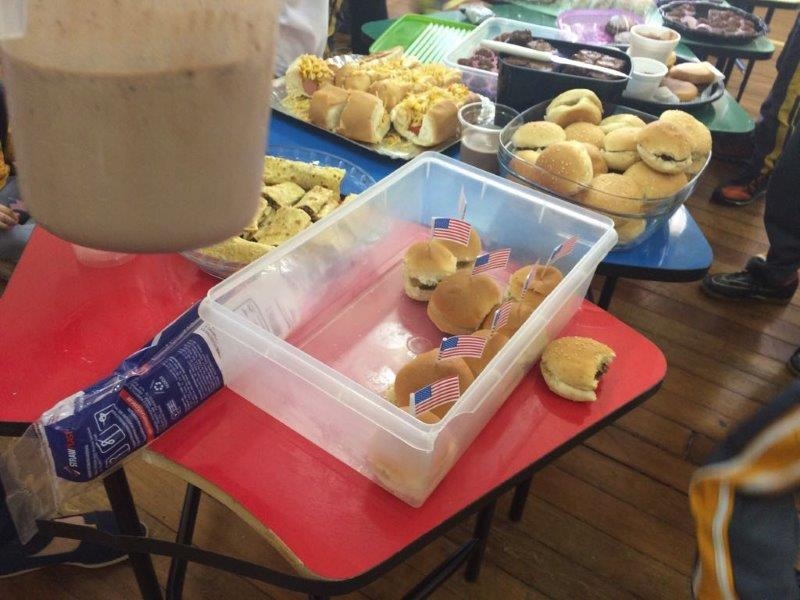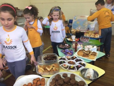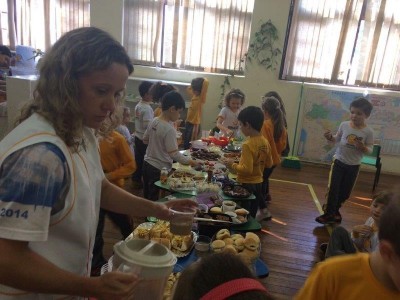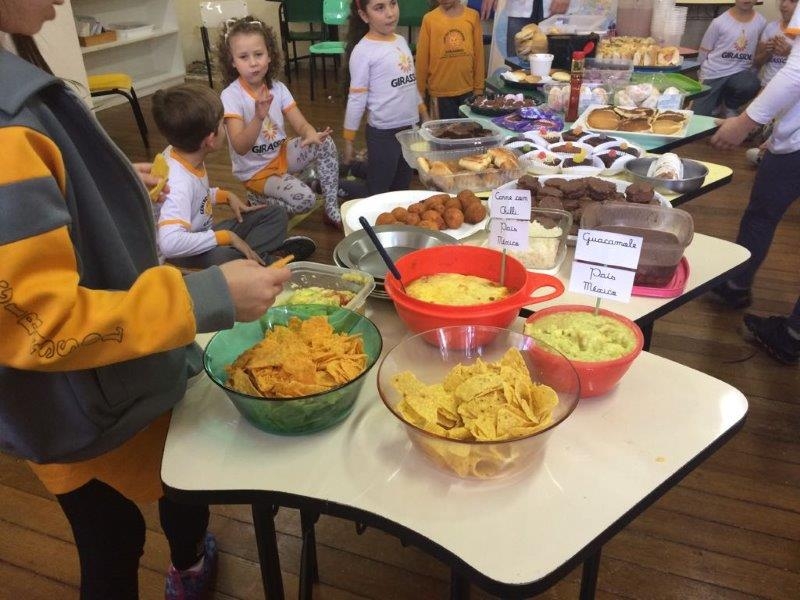 Como é de costume das turmas ao estudarem os países e suas culturas, a turma do primeiro ano fez um grande banquete com comidas populares de diversos países. Cada aluno trouxe um prato tipico ou popular para compartilhar com os colegas, alguns caracterizaram com as bandeiras que representa o país, além de claro todos se deliciarem com um ótimo lanche.