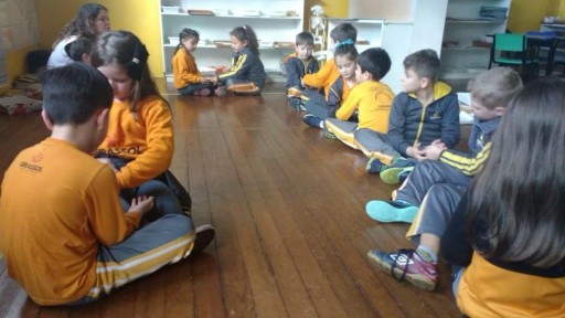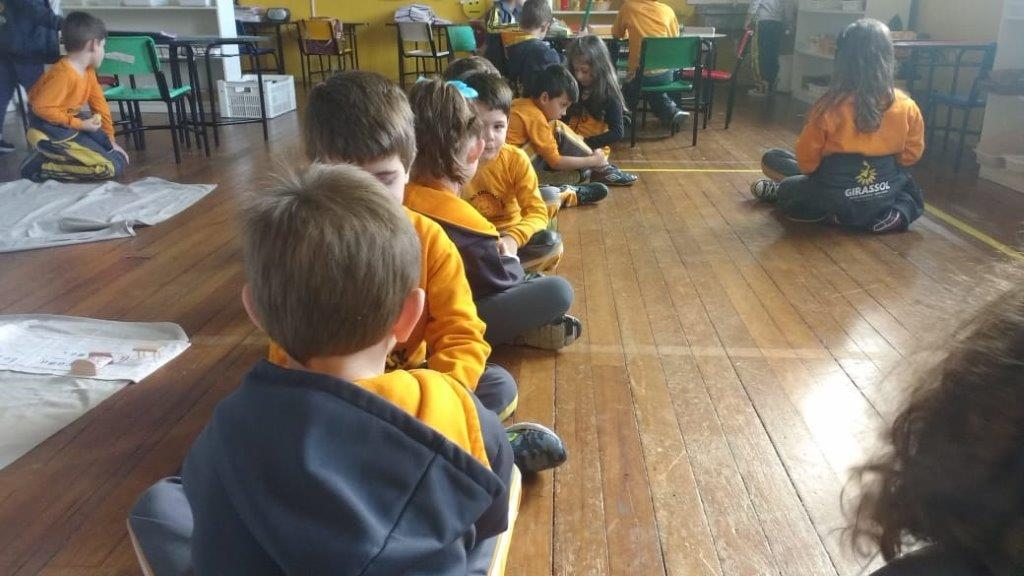 A turma do 1º ano realiza aula de linha semanalmente, onde as crianças aprendem novos conceitos e socializam seu conhecimento com os colegas. A aula de linha consiste em alguns passos: