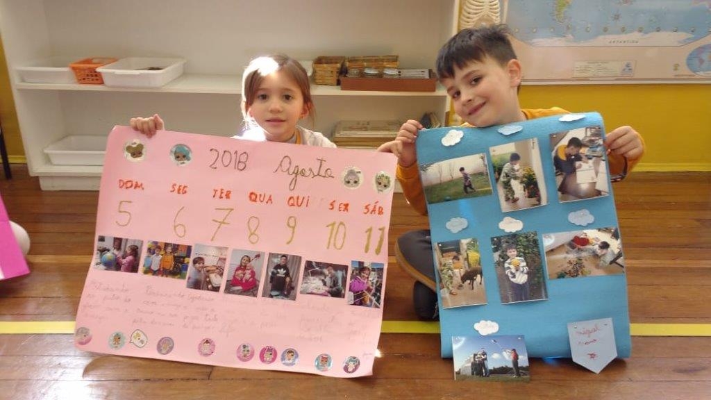 A turma do 1º ano está trabalhando sobre o tempo e dentro desse assunto o calendário. Portanto, as crianças tiveram como tema de casa a confecção de um cartaz com o auxílio dos pais, onde para cada dia da semana deveriam registrar uma fotografia e a descrição da atividade realizada neste dia. As crianças apresentaram suas pequenas histórias aos colegas, demonstrando muito entusiasmo e alegria!