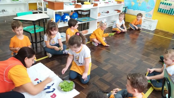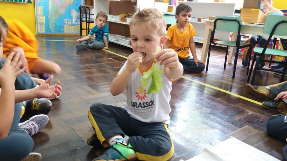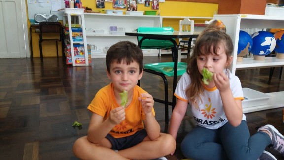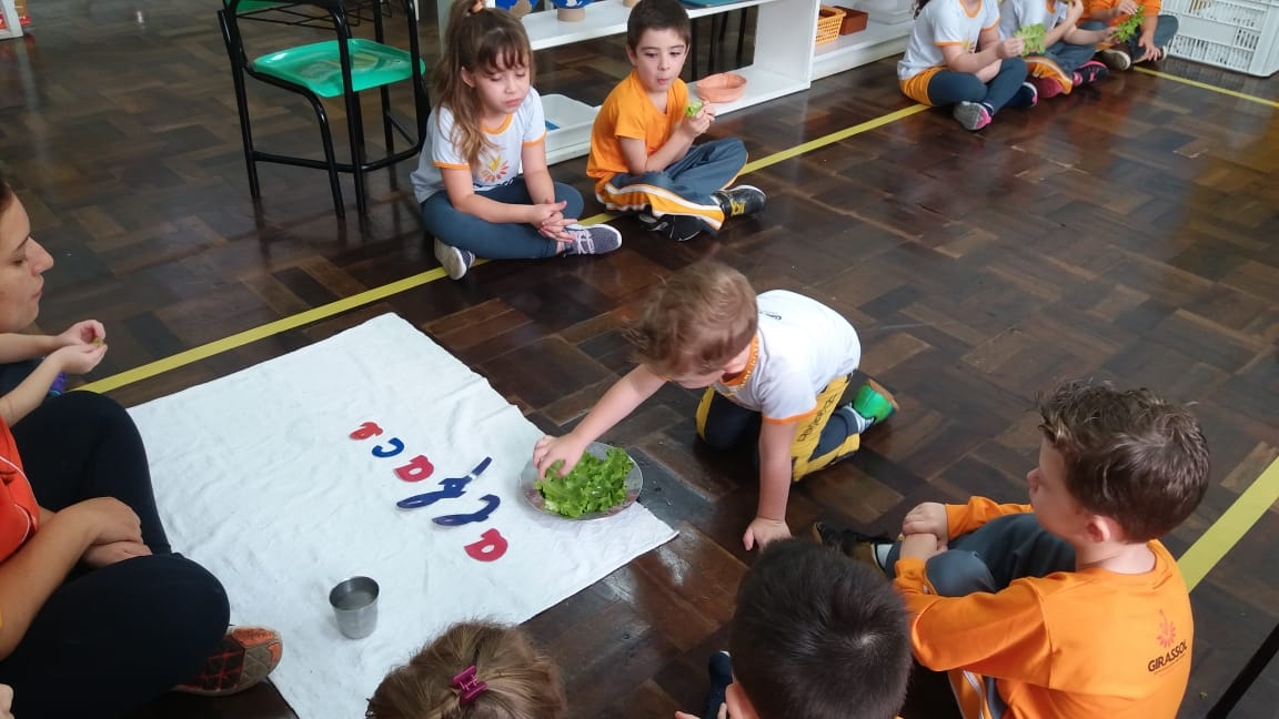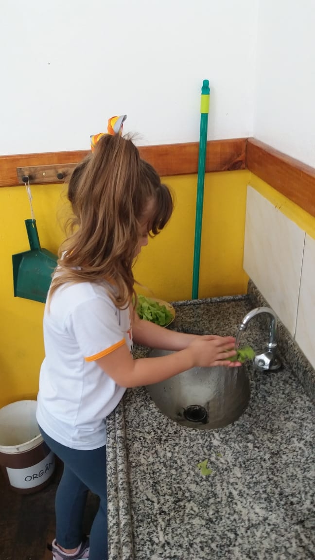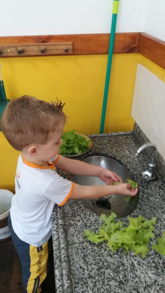 Nas aulas de Educação Ambiental que fazem parte do Currículo Montessoriano na Educação Infantil nossas professoras se utilizam de estratégias que possam sempre estimular o paladar assim como o conhecimento pelo meio ambiente e outras áreas de desenvolvimento. Nesta aula a professora da Turma Quero-Quero do período matutino levou nossos pequenos para colherem na horta da escola a alface para degustarem em sala, trabalhando o aspecto da linguagem com o nome da salada. Uma verdadeira aula Montessori!