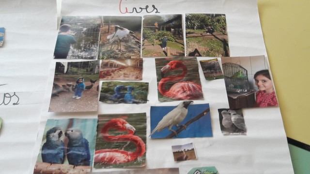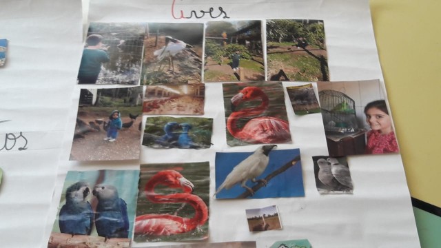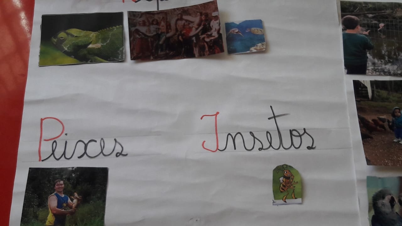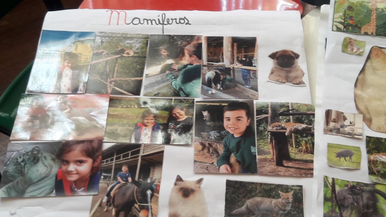 Figuras de animais trazidas pelos alunos para classificação em conjunto em sala de aula com confecção de cartazes;