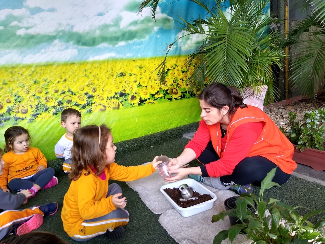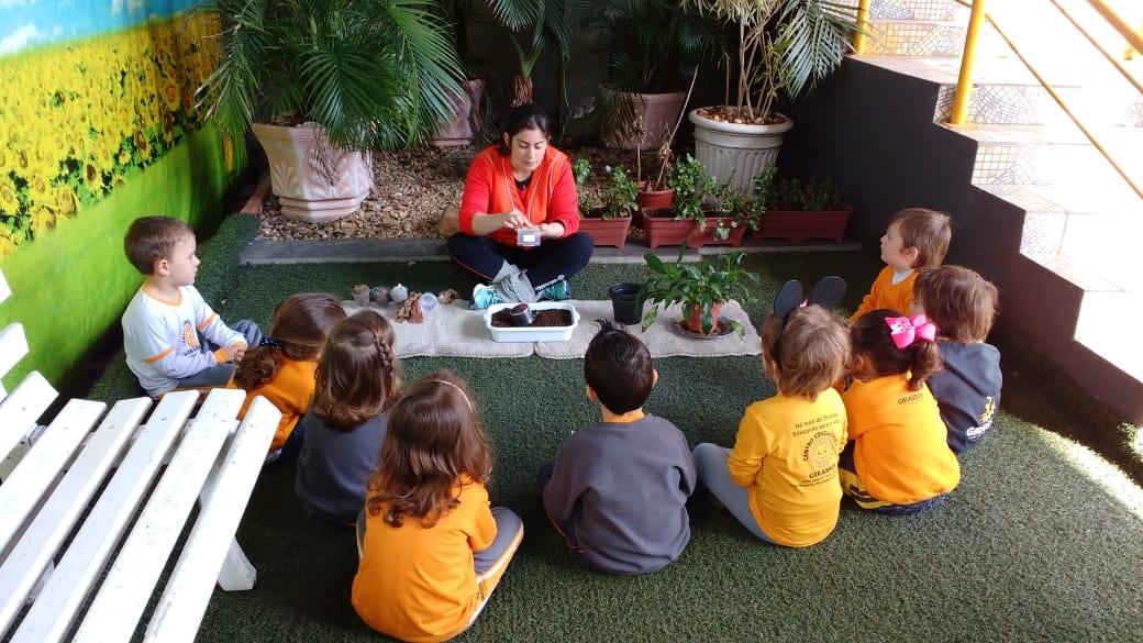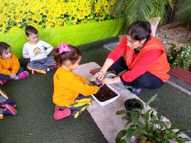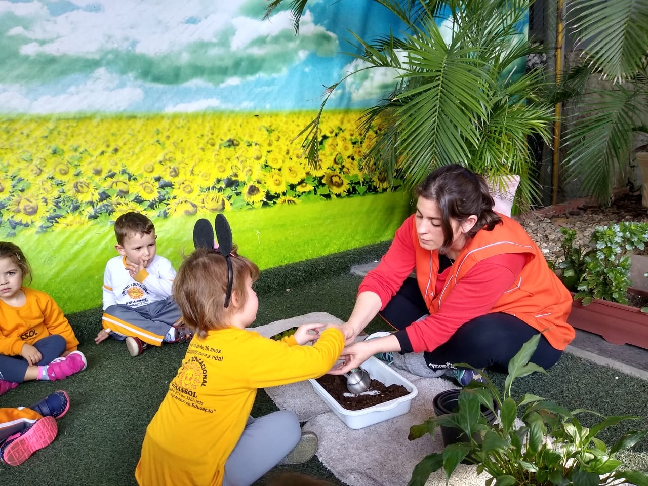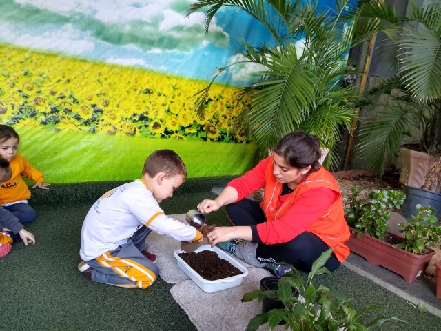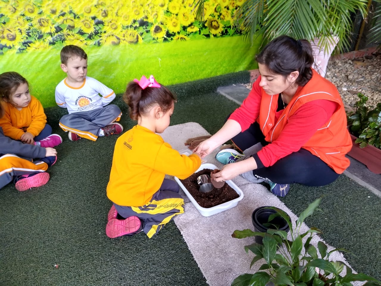 A educação ambiental faz parte do currículo de vida prática em nossa escola. A fim de estimularmos o cuidado com o ambiente tanto interno quanto externo as professoras realizam atividades utilizando as mais variadas estratégias de ensino. Neste caso as professoras da turma Bem-Te-Vi ao estudarem as diferenças entre Horta, Pomar e Jardim com as crianças plantaram flores e conheceram as partes da planta, realizando assim uma atividade prática que posteriormente tem como segundo passo observar o crescimento da planta e suas necessidades.