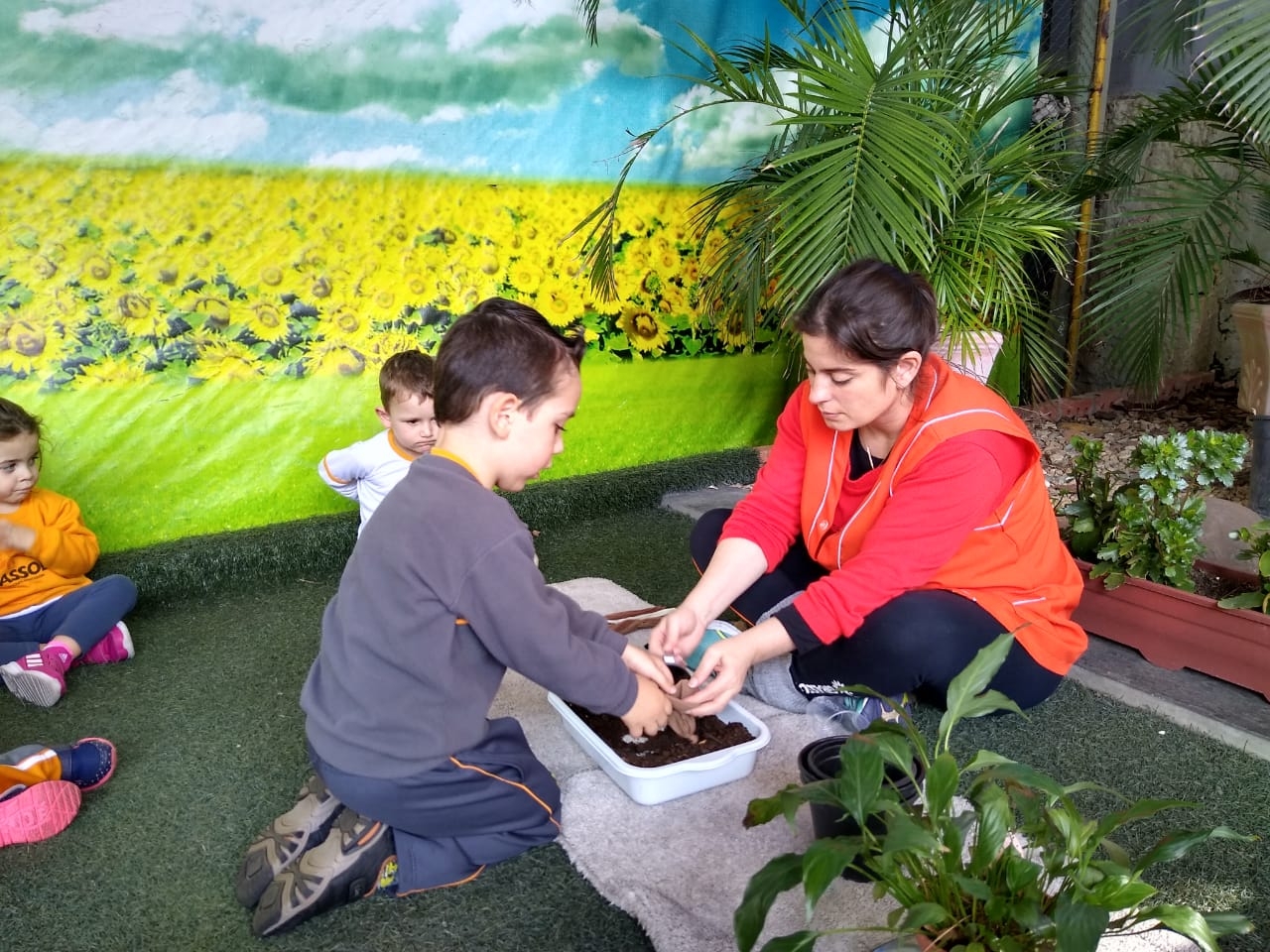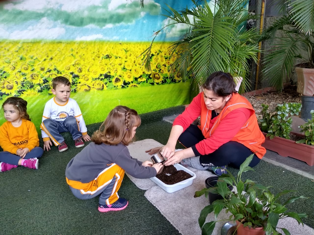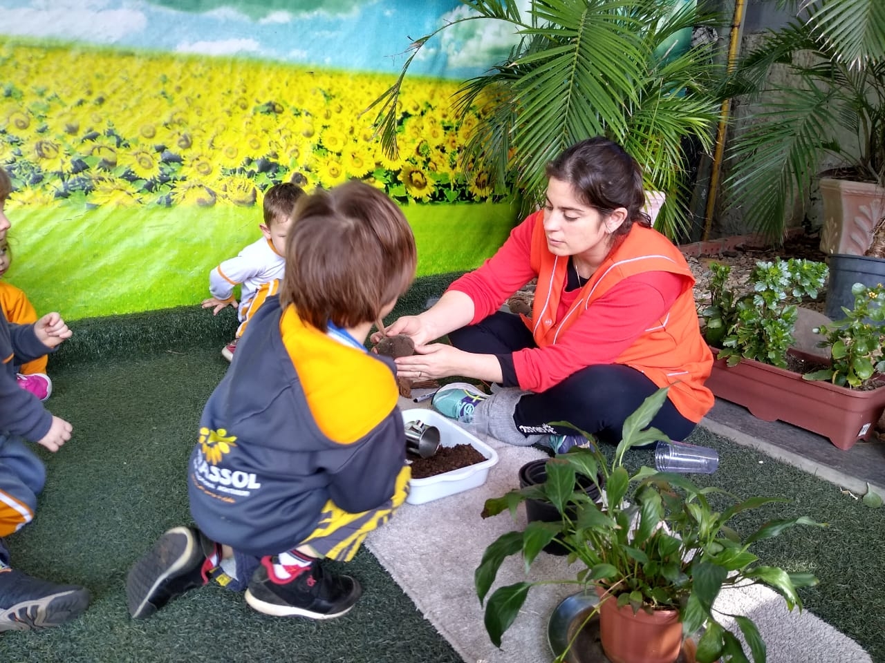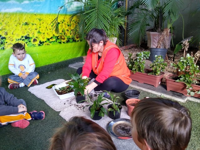 A educação ambiental faz parte do currículo de vida prática em nossa escola. A fim de estimularmos o cuidado com o ambiente tanto interno quanto externo as professoras realizam atividades utilizando as mais variadas estratégias de ensino. Neste caso as professoras da turma Bem-Te-Vi ao estudarem as diferenças entre Horta, Pomar e Jardim com as crianças plantaram flores e conheceram as partes da planta, realizando assim uma atividade prática que posteriormente tem como segundo passo observar o crescimento da planta e suas necessidades.
