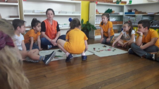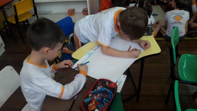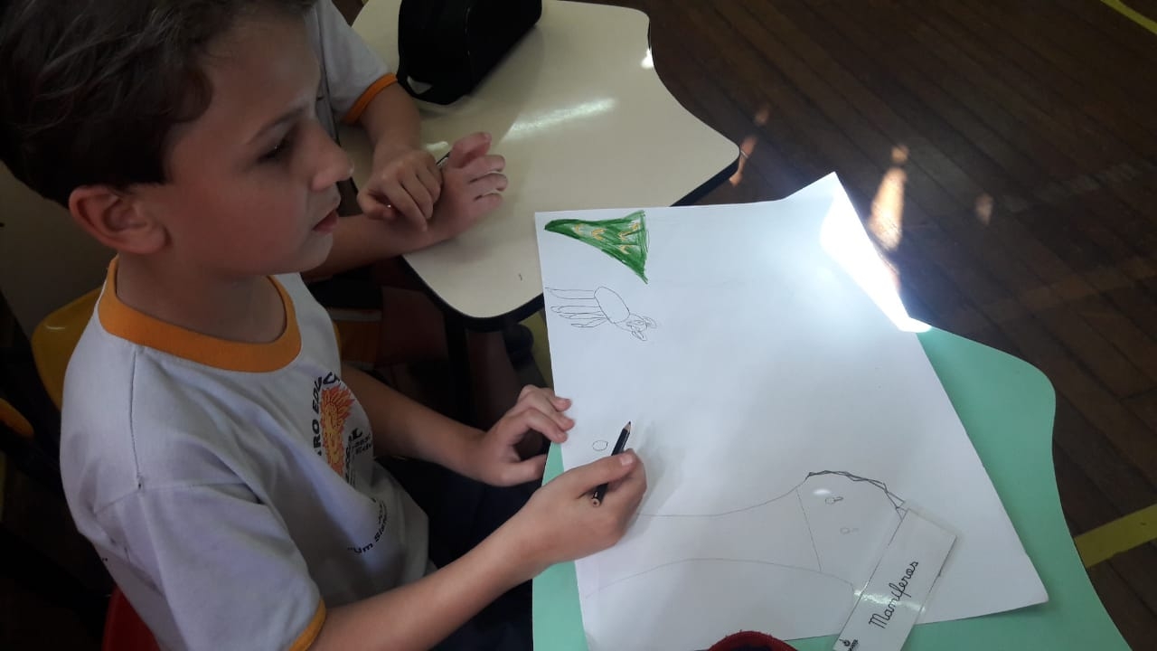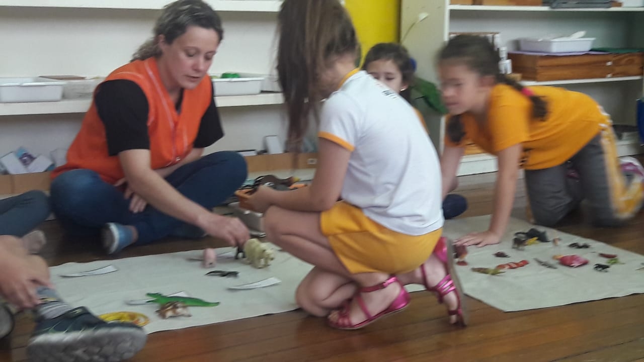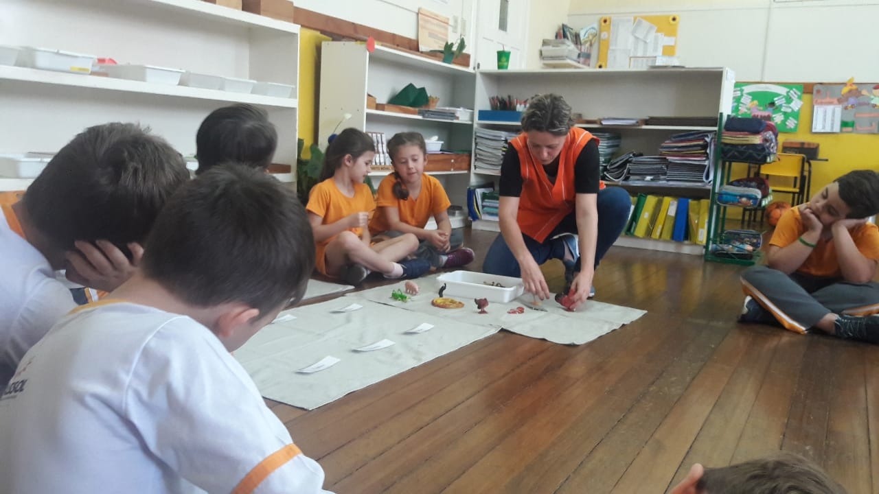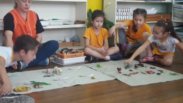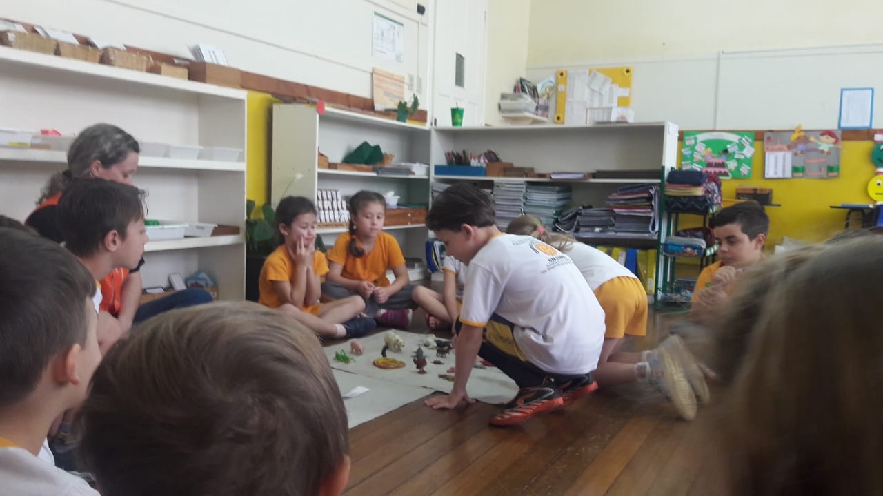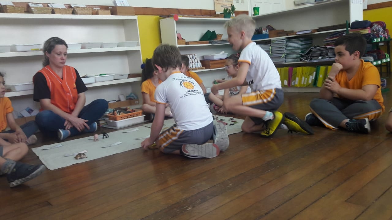 O 1º Ano do Ensino Fundamental estudou a classificação dos animais: vertebrados e invertebrados. Com o auxílio das educadoras, foram realizadas atividades nas mantas, onde as crianças deveriam colocar os animais de acordo com sua classe. Os alunos registraram a atividade com desenhos sobre os animais, como forma de complementar o estudo, além de todo material disponível em sala de aula com cartões, nomenclatura e objeto no tridimensional.