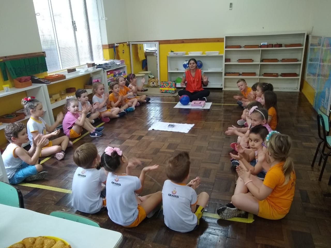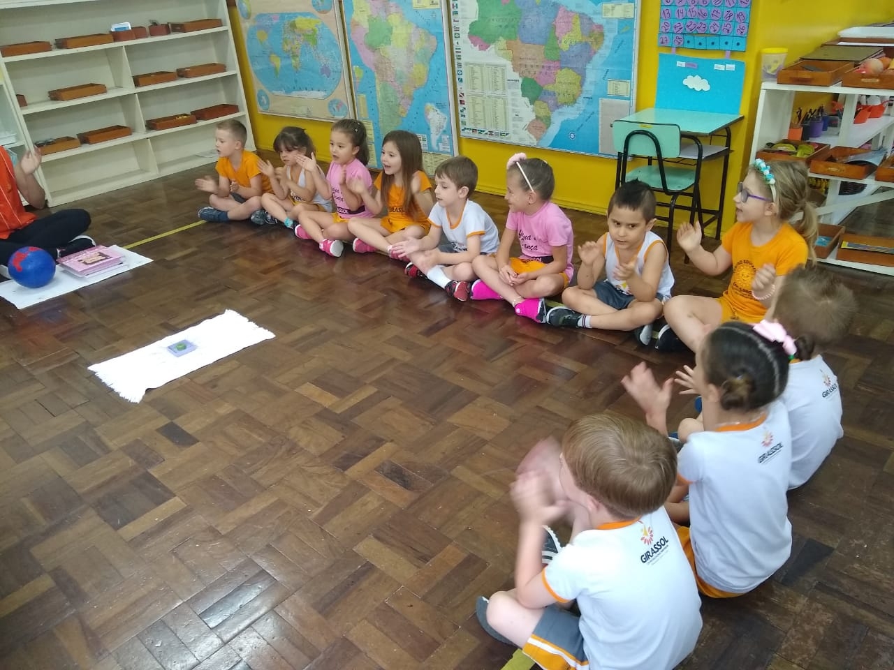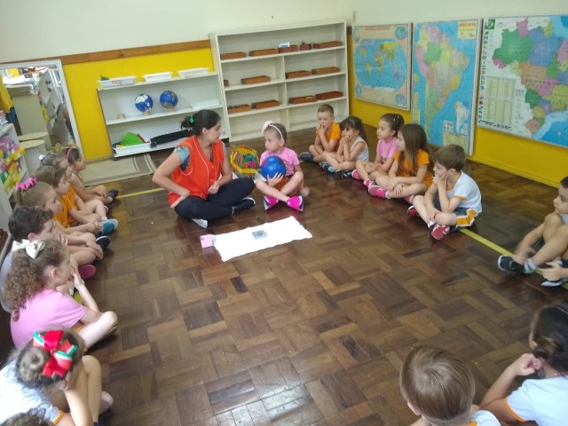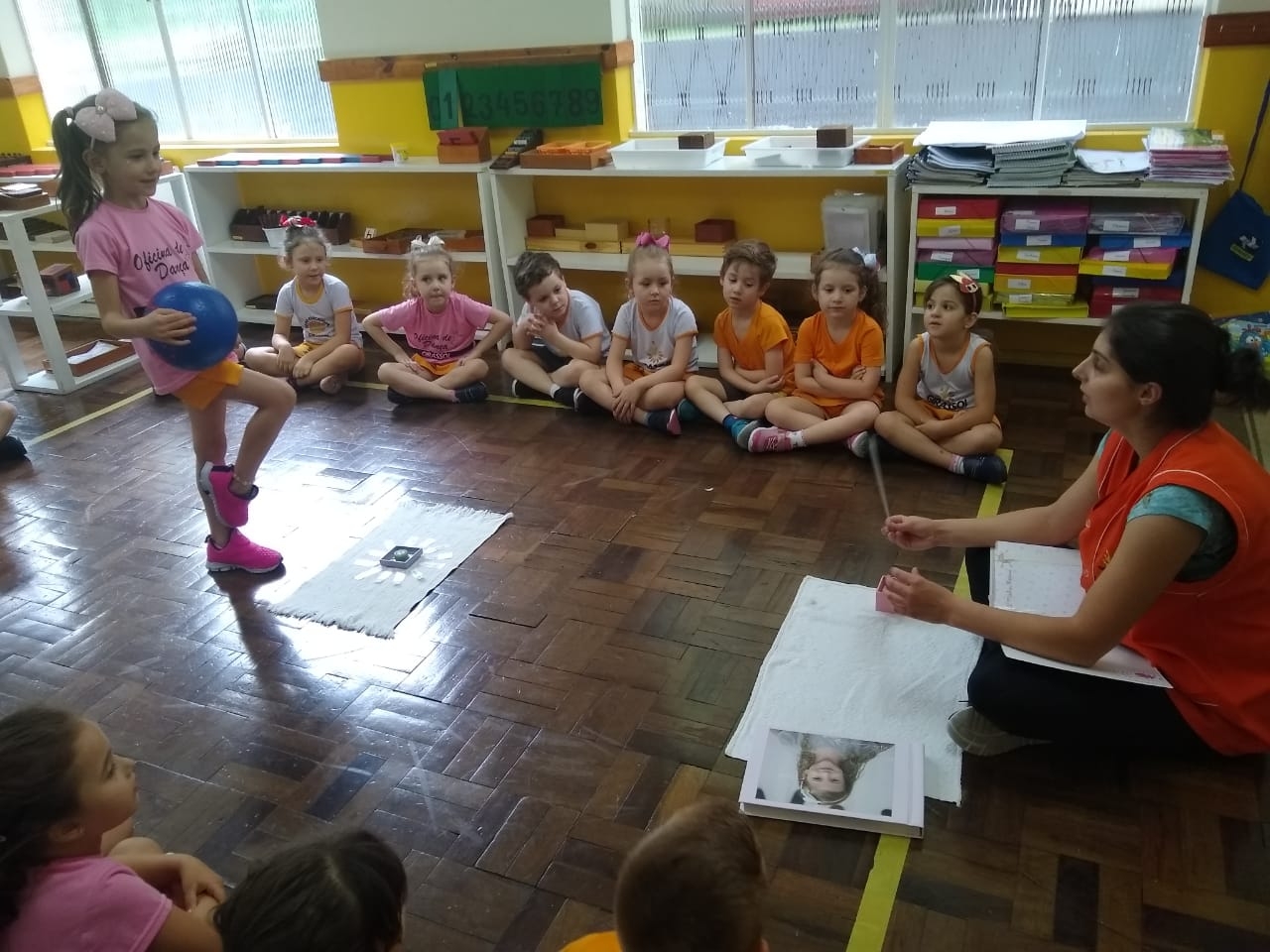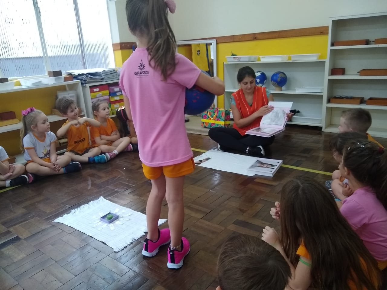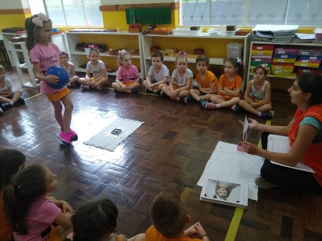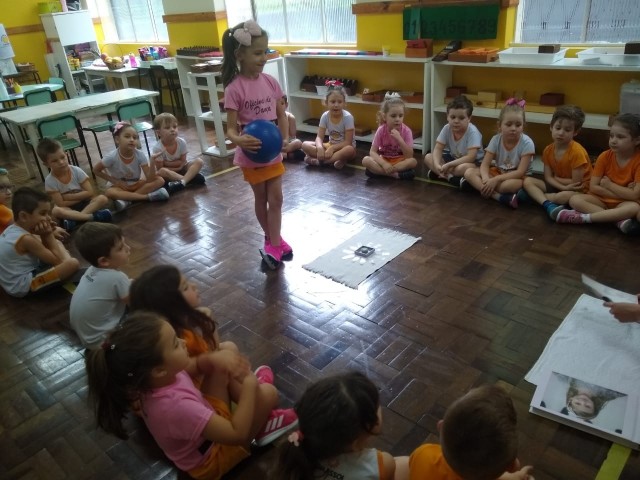 Para comemorar o aniversário da colega Ana Caroline, os alunos da turma Rouxinol matutino participaram do Ritual de Aniversário Montessori, que consiste em a professora apresentar aos alunos através de fotografias os anos que se passaram, para que possam perceber as transformações ocorridas com o passar do tempo. A atividade é muito interessante, pois além de comemorar o aniversário da amiga, as crianças podem compreender acerca do passar do tempo através da utilização do globo, entendendo quanto tempo demora para a Terra dar seu giro completo e o que significa o passar de um ano.