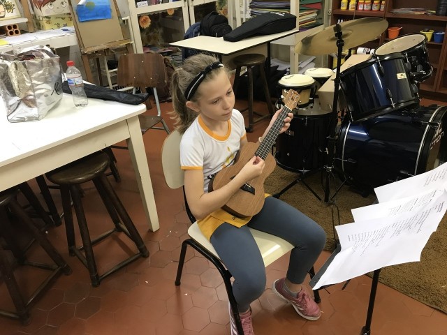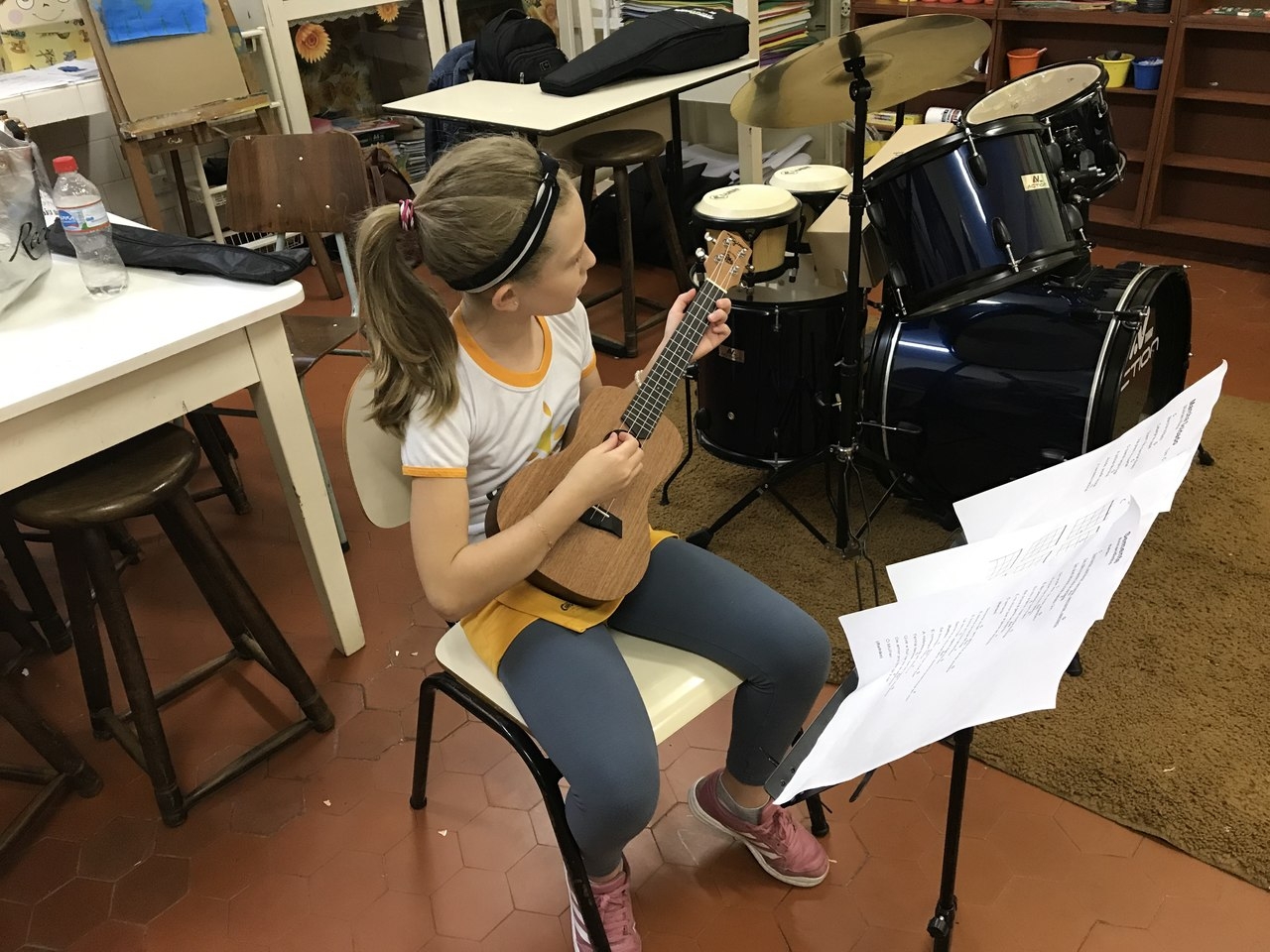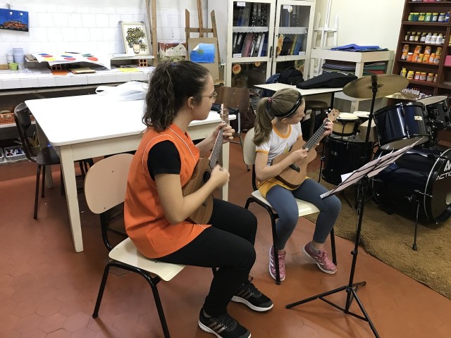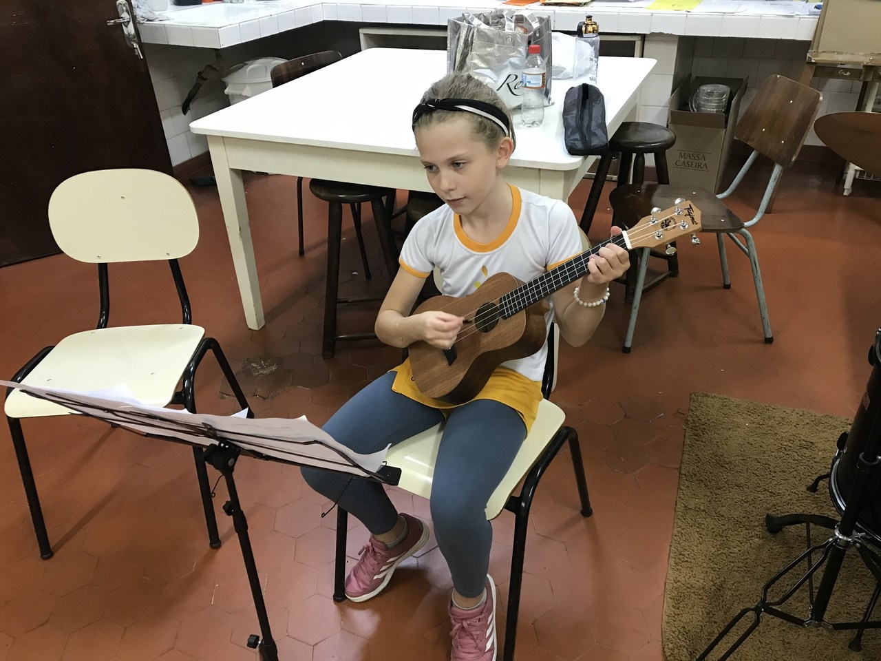 A iniciação musical, tanto na Educação Infantil quanto no Ensino Fundamental, estimula áreas do cérebro da criança que vão beneficiar o desenvolvimento de outras linguagens. Aqui na Escola Girassol são oferecidas aulas extras de violão e ukulelê, com a professora Jessica Alves da Silva, formada em Música pela Unoesc, que incentiva o conteúdo artístico e cultural para alunos que demonstram interesse por algum instrumento. Vale destacar o aspecto da socialização, que é um dos mais importantes, porque a música tende a integrar a criança. Nosso maior objetivo é encantar a criança com as possibilidades que a música pode oferecer.