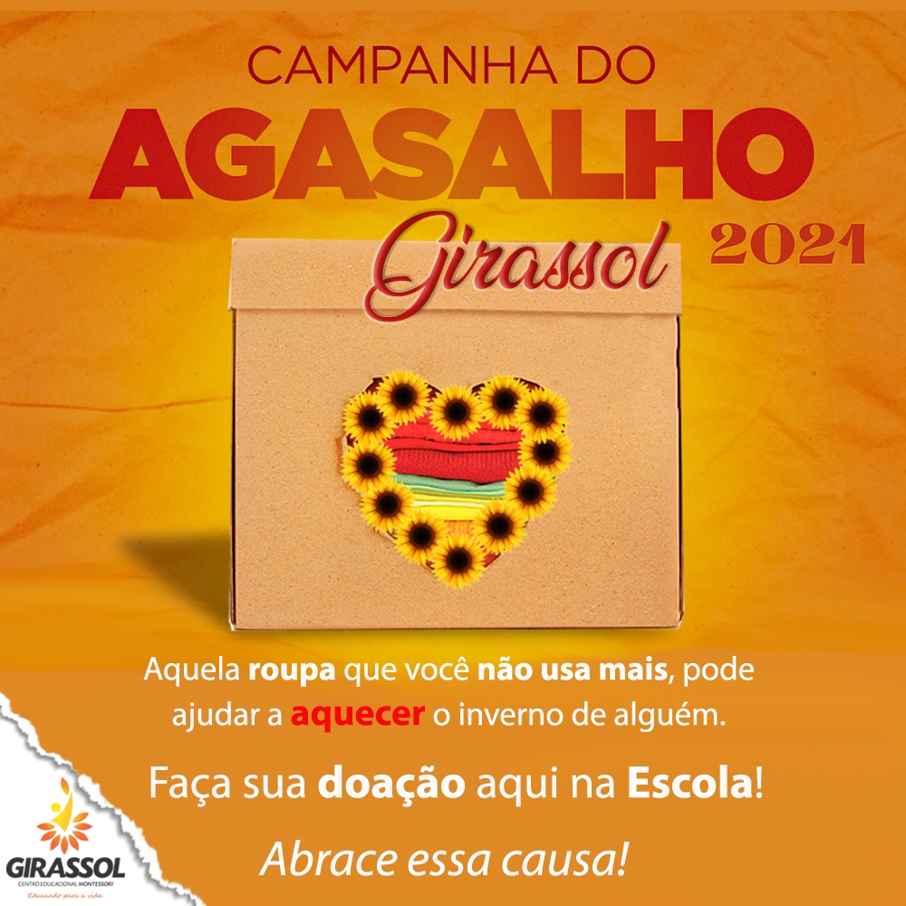 A Escola Girassol realiza anualmente várias campanhas solidárias com o objetivo de estimular a solidariedade e o cuidado com o meio ambiente, sempre com a parceria das famílias.Na última semana, a Direção da Escola Girassol realizou a entrega das roupas arrecadadas durante a Campanha do Agasalho, doadas por nossos alunos neste primeiro semestre de 2021. A entrega foi feita para o CRAS de Joaçaba, que distribuirá às pessoas mais carentes.Ações como essa são constantes em nossa Escola, por isso, reforçamos que no próximo semestre continuaremos recebendo tampinhas de garrafa, pilhas, lacres de latinhas e óleo de cozinha, que serão doadas para outras instituições que necessitam de auxílio.