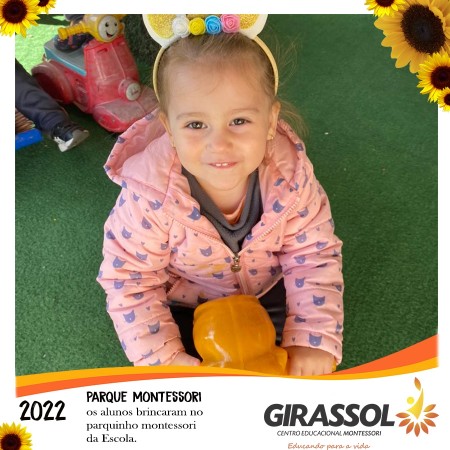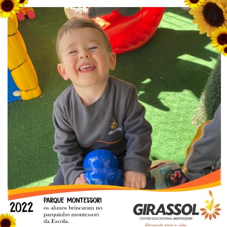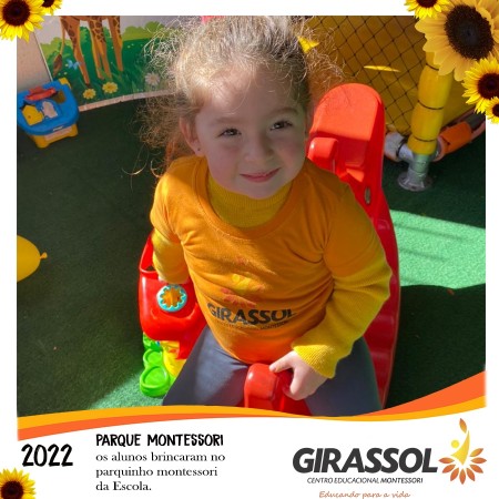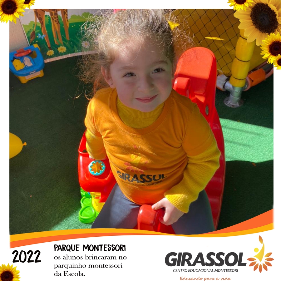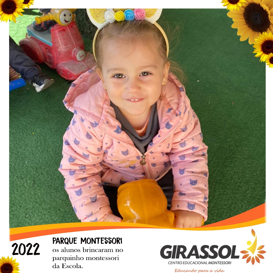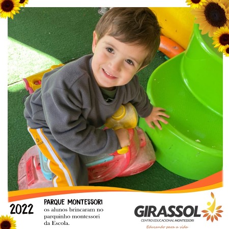 A hora da brincadeira livre na Escola Girassol é nomeada Parque Montessori, onde crianças de várias idades e de diferentes classes brincam juntas. Temos no ambiente uma pequena comunidade onde todos encontram lugar como indivíduos e como membros de um grupo. Essa prática favorece a socialização, a independência e a conquista da autonomia através da vivência em grupo, diminuindo a competição e a comparação. Uma verdadeira classe Montessori fora da sala de aula!