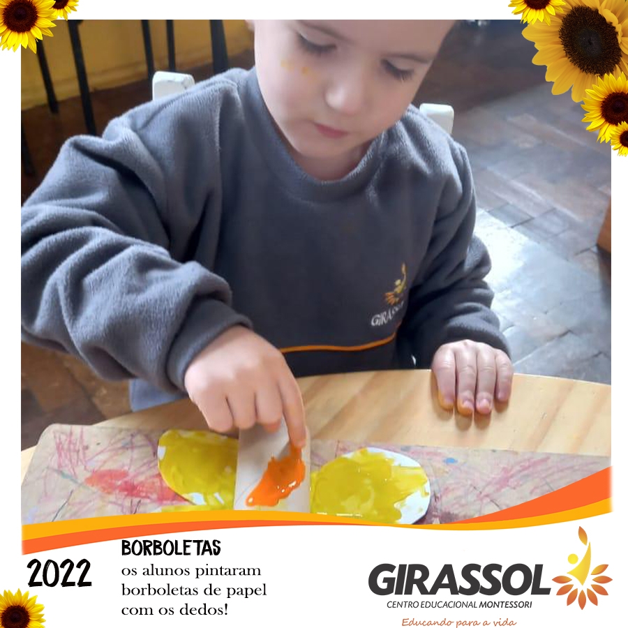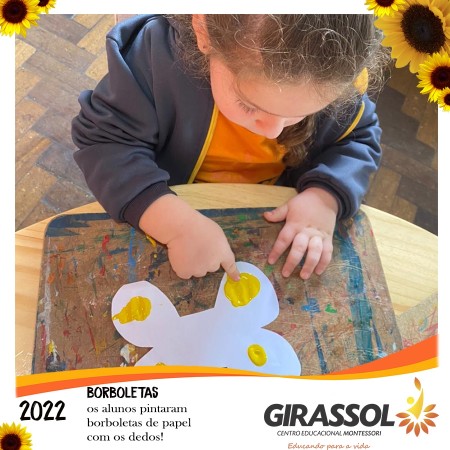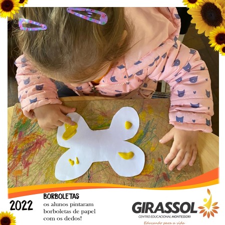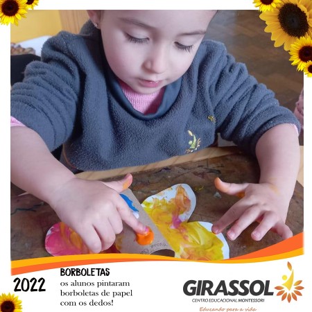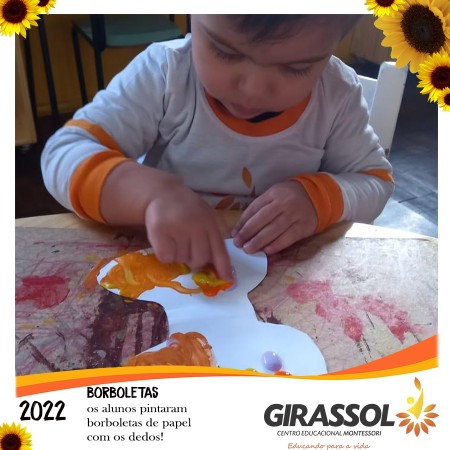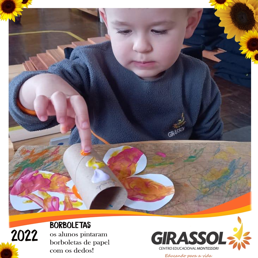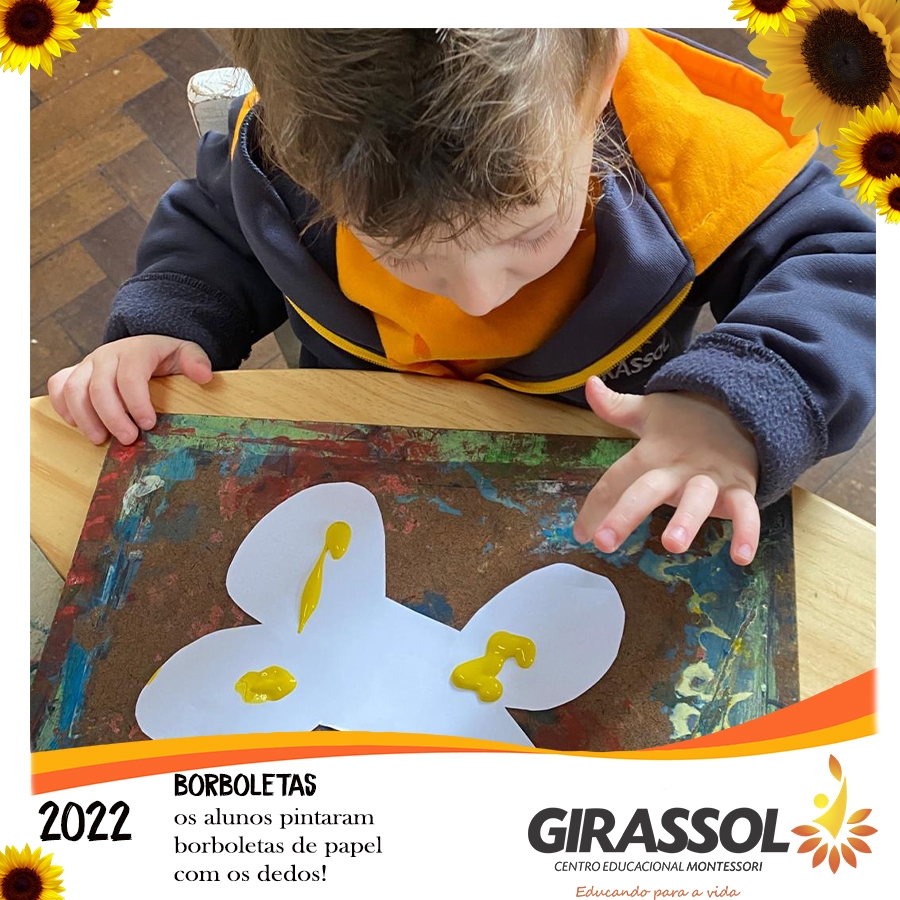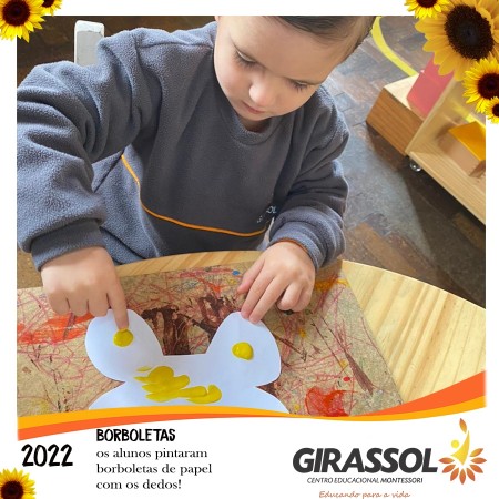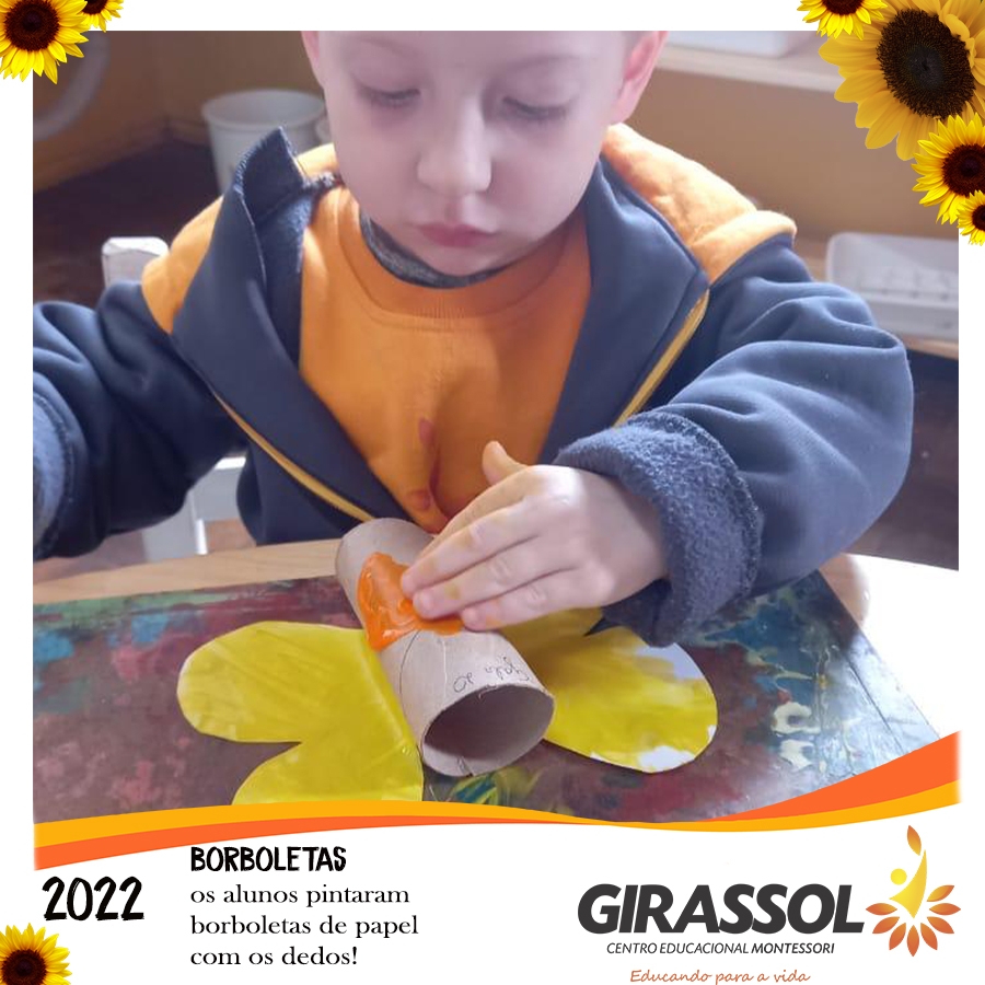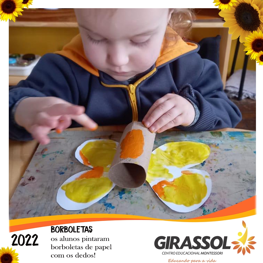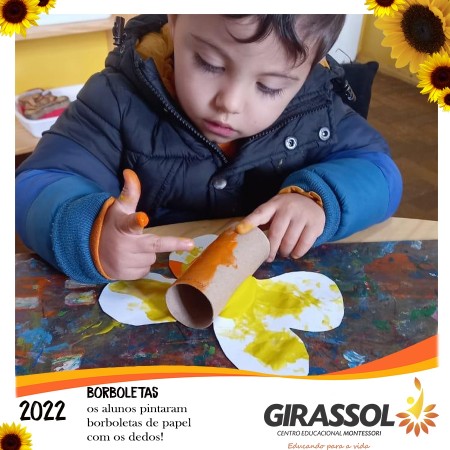 Nas escolas Montessori as práticas educativas devem proporcionar experiências novas sempre que possíveis para aumentar o conhecimento tanto linguístico da criança como conhecimento de mundo. Os alunos da Turma Andorinha, em uma atividade proposta pelas professoras, pintaram com os dedos borboletas feitas de rolos de papel.
