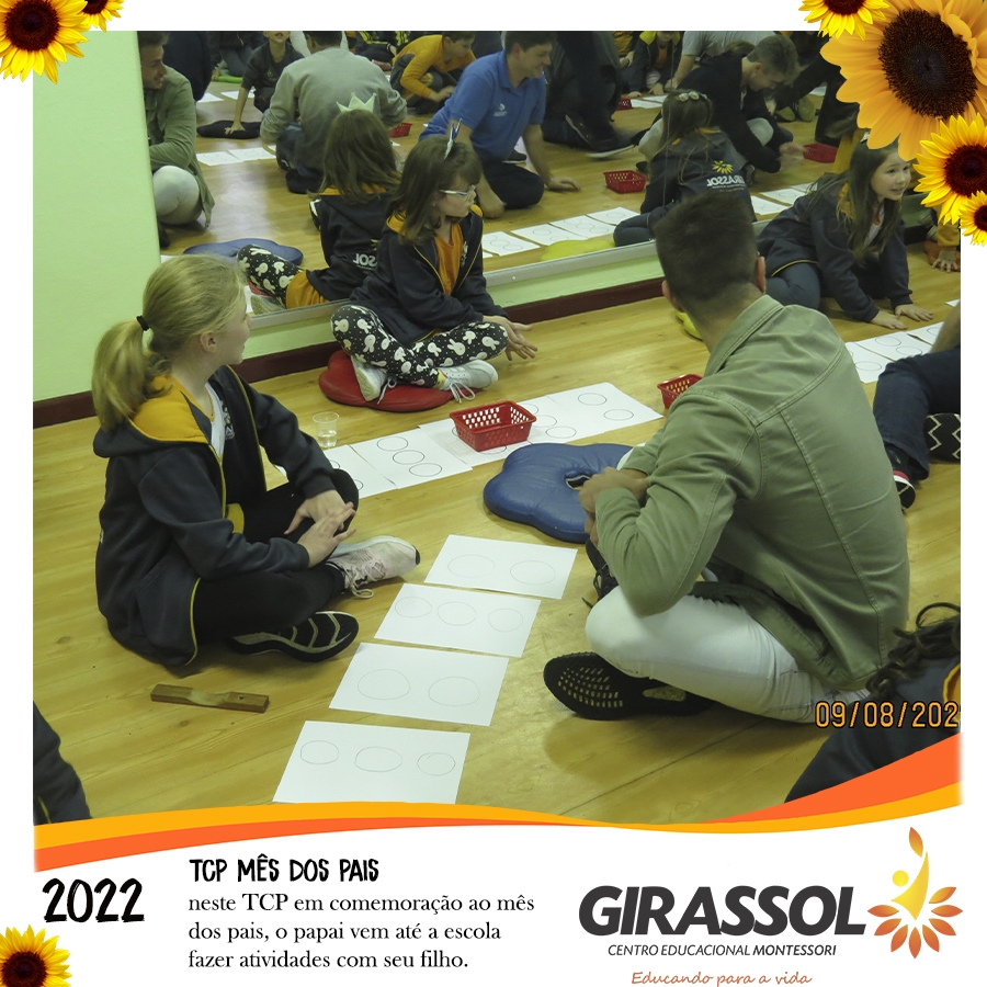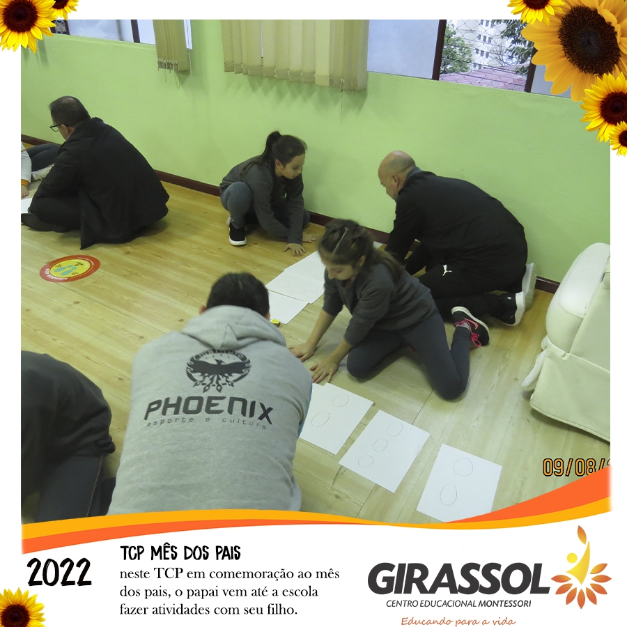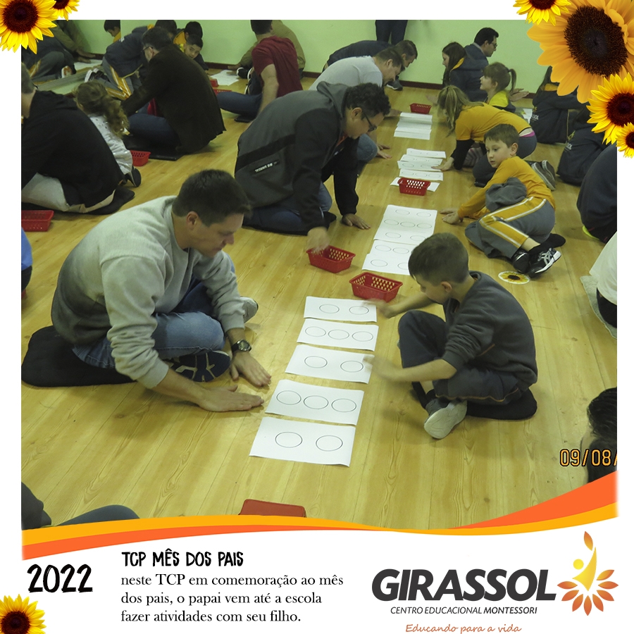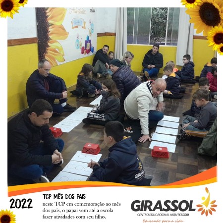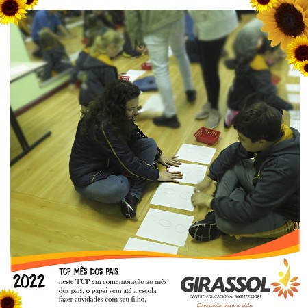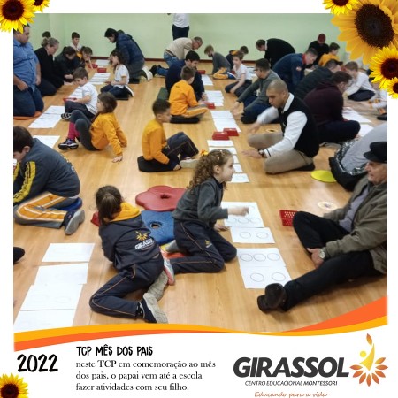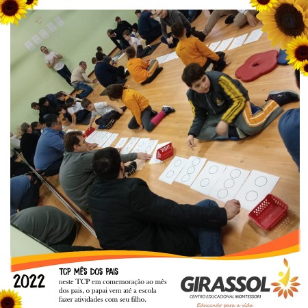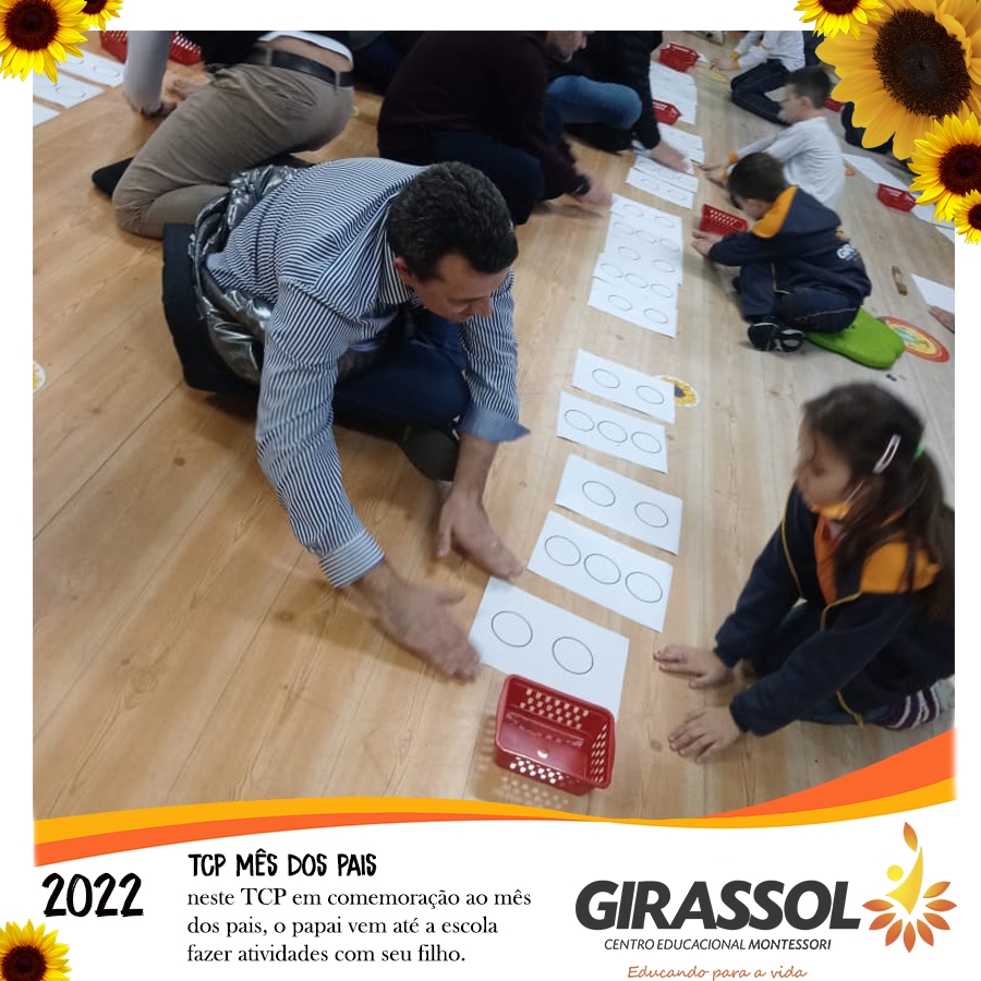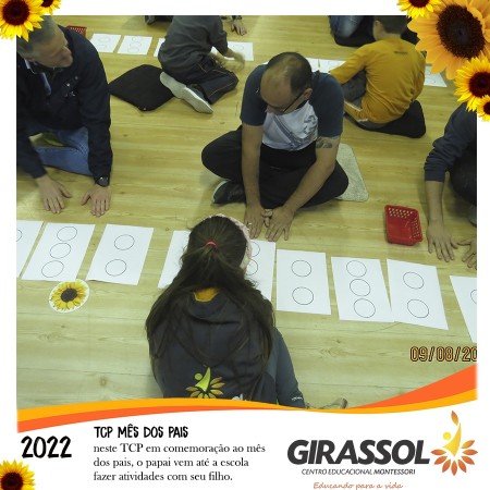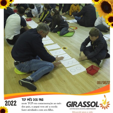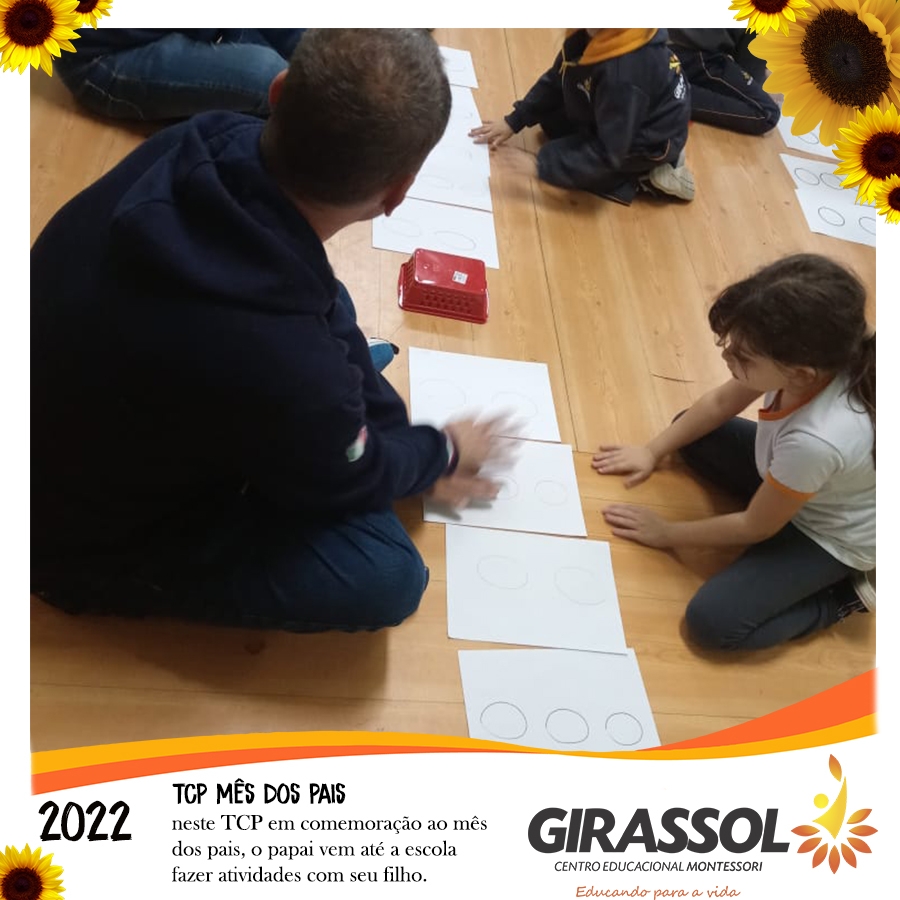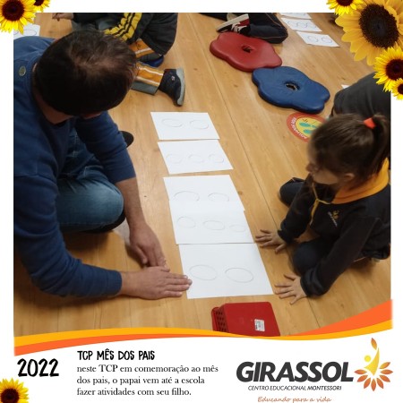 Com o objetivo de proporcionar um momento em família e também para que a família conheça melhor a metodologia Montessori e a rotina da criança em sala de aula nosso segundo TCP (Trabalho Conjunto com Pais) do ano de 2022 foi realizado com enfoque nos papais onde cada pai em homenagem ao seu dia pôde estar com seu filho realizando atividades apresentadas pelos professores de aulas extras. A atividade foi pensada com o objetivo de proporcionar um momento especial entre pais e filhos!
