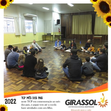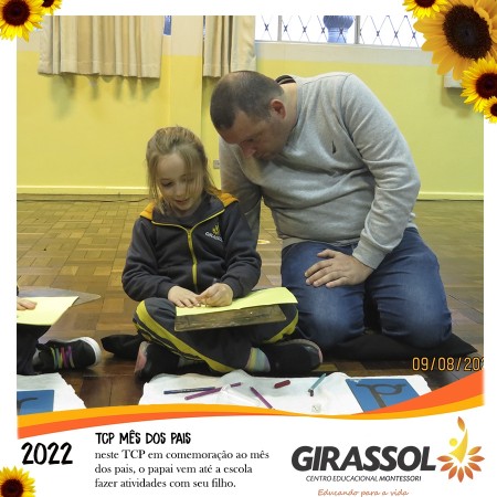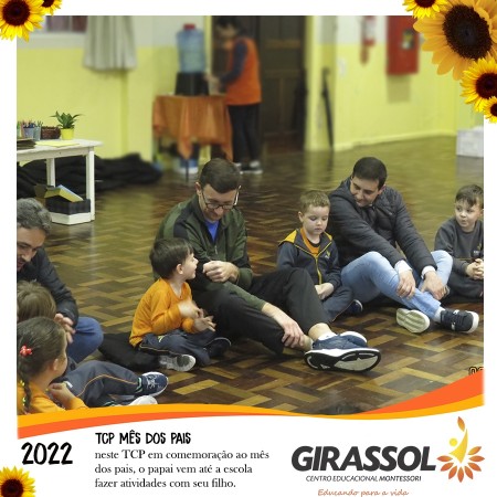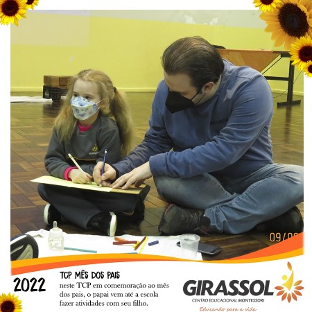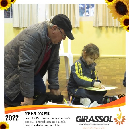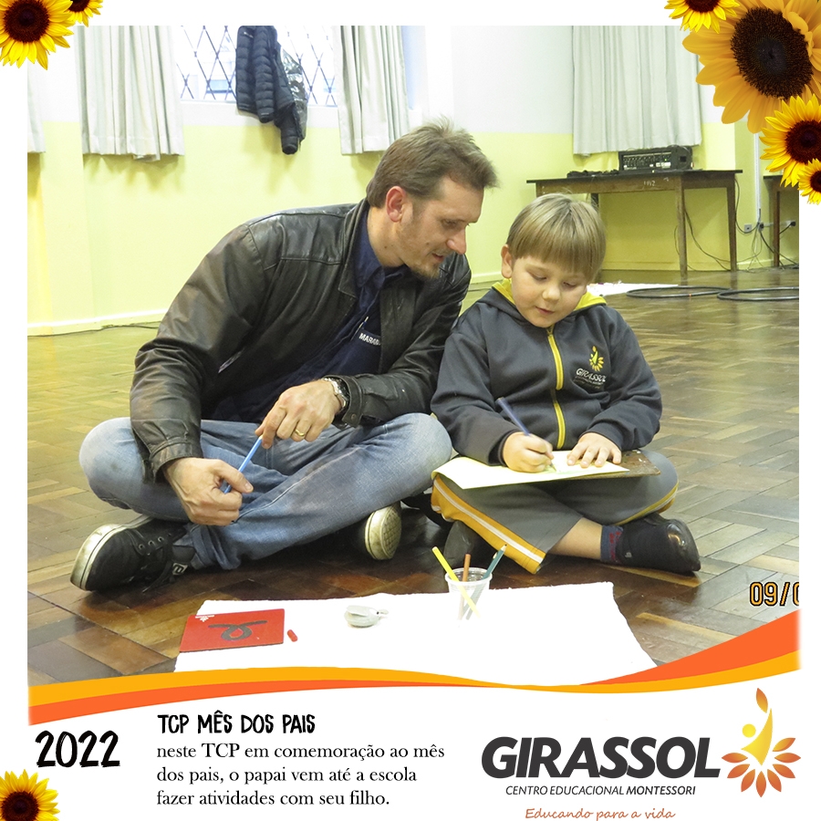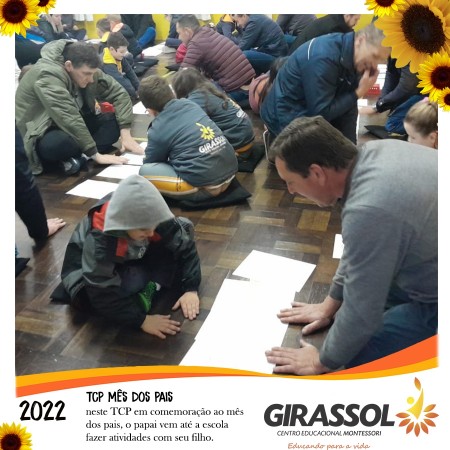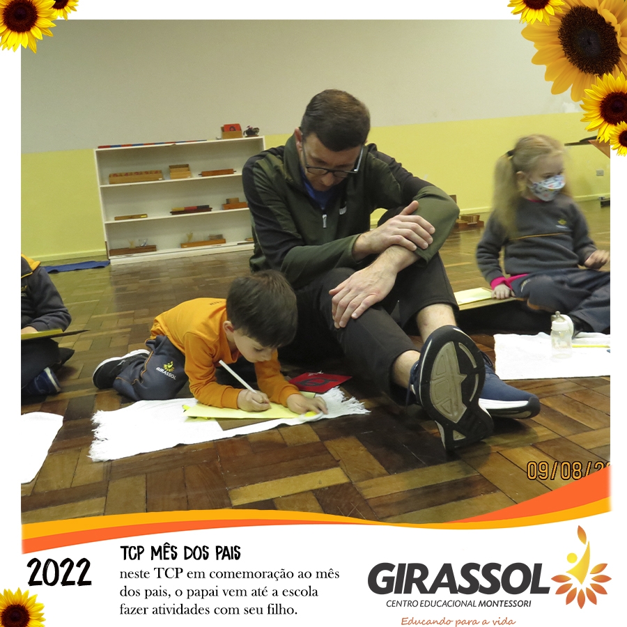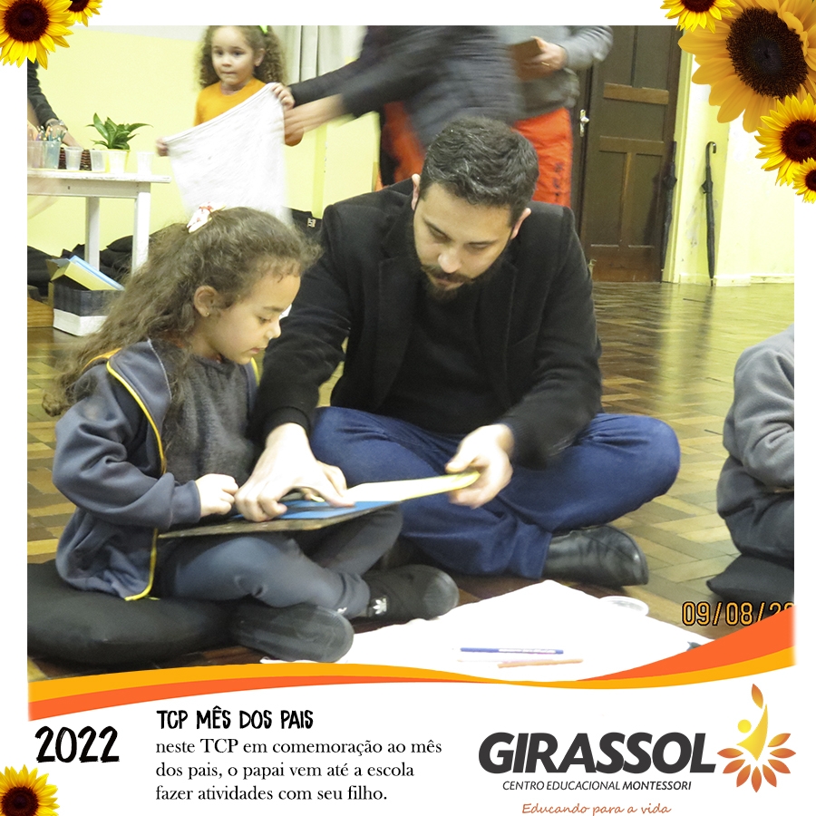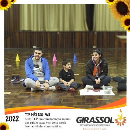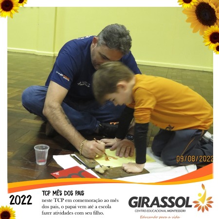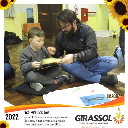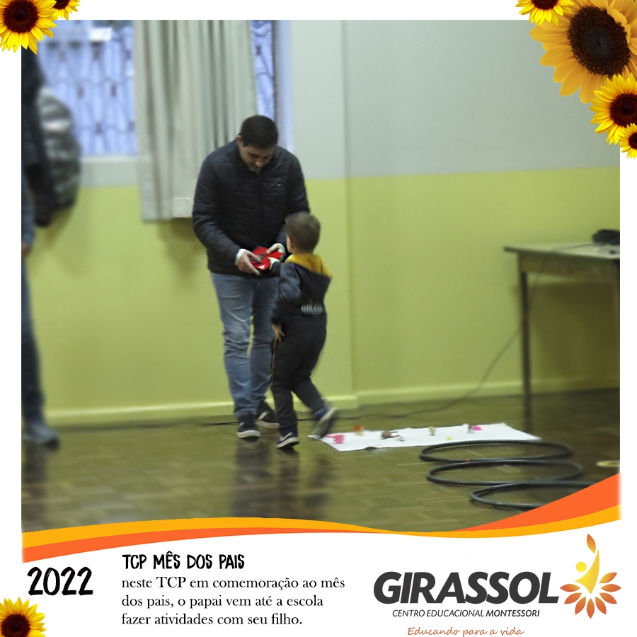 Com o objetivo de proporcionar um momento em família e também para que a família conheça melhor a metodologia Montessori e a rotina da criança em sala de aula nosso segundo TCP (Trabalho Conjunto com Pais) do ano de 2022 foi realizado com enfoque nos papais onde cada pai em homenagem ao seu dia pôde estar com seu filho na sala de aula realizando atividades. A atividade foi pensada com o objetivo de proporcionar um momento especial entre pais e filhos!