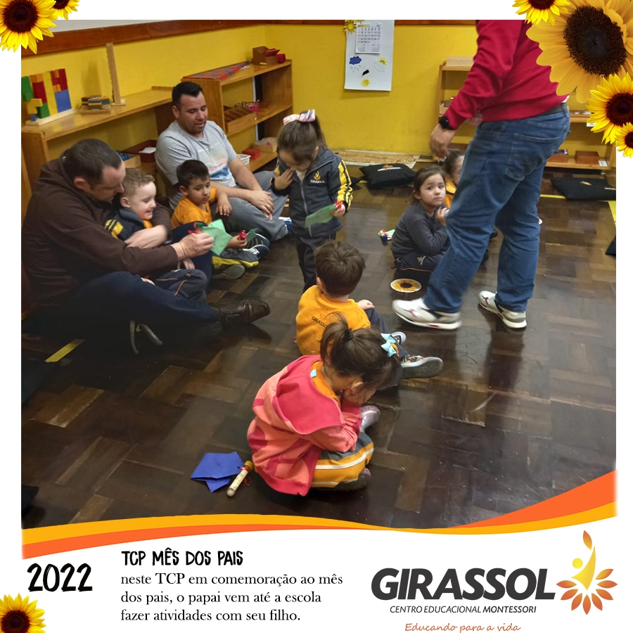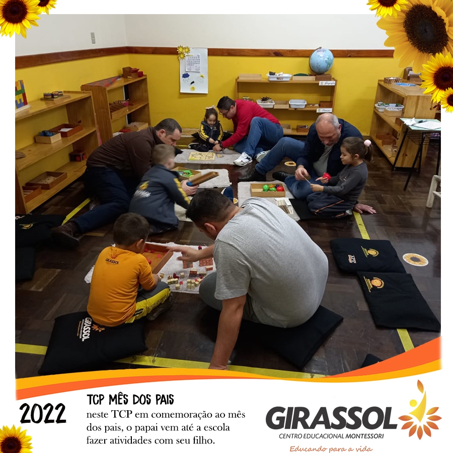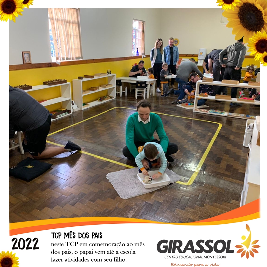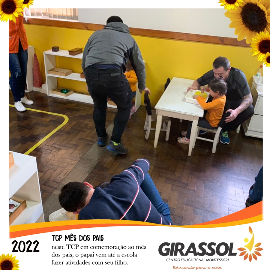 Com o objetivo de proporcionar um momento em família e também para que a família conheça melhor a metodologia Montessori e a rotina da criança em sala de aula nosso segundo TCP (Trabalho Conjunto com Pais) do ano de 2022 foi realizado com enfoque nos papais onde cada pai em homenagem ao seu dia pôde estar com seu filho na sala de aula realizando atividades. A atividade foi pensada com o objetivo de proporcionar um momento especial entre pais e filhos!