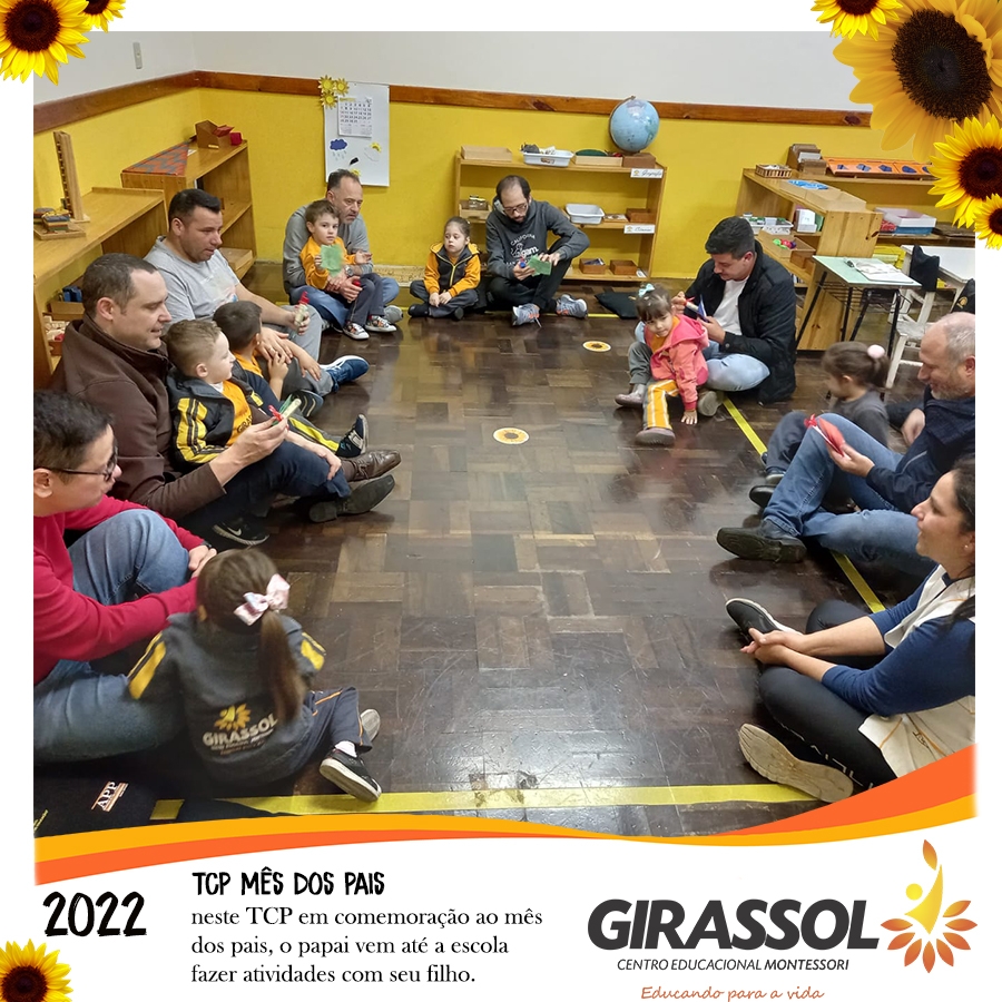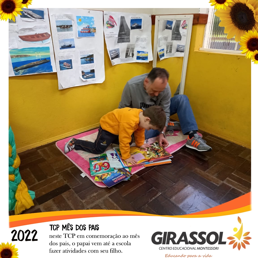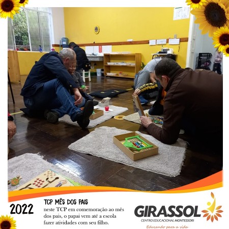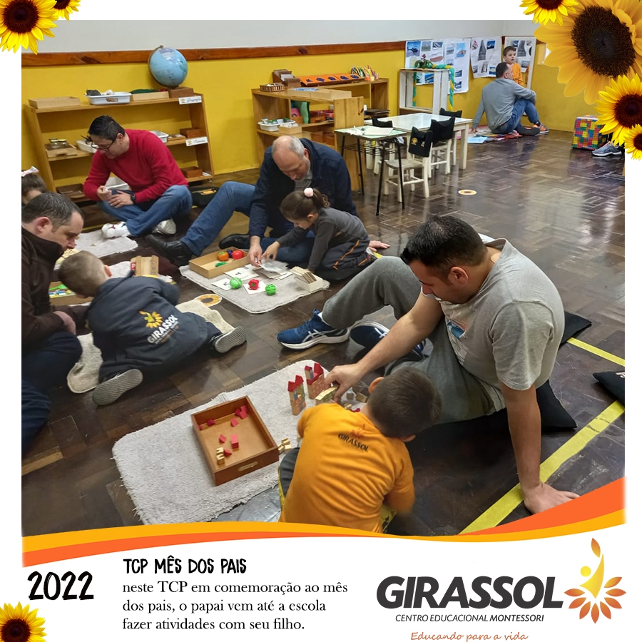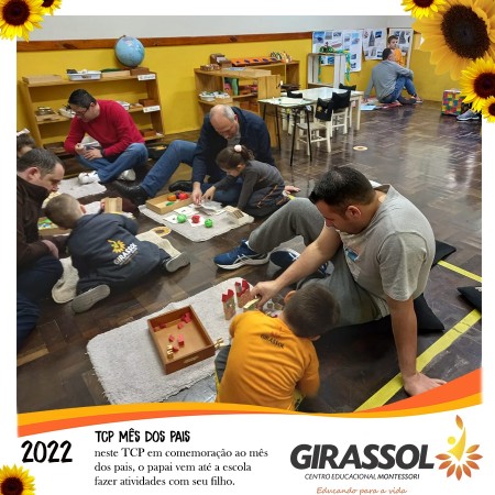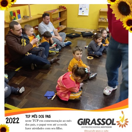 Com o objetivo de proporcionar um momento em família e também para que a família conheça melhor a metodologia Montessori e a rotina da criança em sala de aula nosso segundo TCP (Trabalho Conjunto com Pais) do ano de 2022 foi realizado com enfoque nos papais onde cada pai em homenagem ao seu dia pôde estar com seu filho na sala de aula realizando atividades. A atividade foi pensada com o objetivo de proporcionar um momento especial entre pais e filhos!