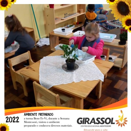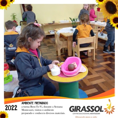 Na Semana Montessori realizada na escola as professoras relacionaram as atividades com Maria Montessori, a fim de mostrar as crianças quem foi essa educadora e o que ela fez em sua vida. Os pequenos da turma Bem-Te-Vi visitaram o ambiente preparado para o Circulo de Estudos com os pais e lá entraram em contato com diversos materiais montessorianos.