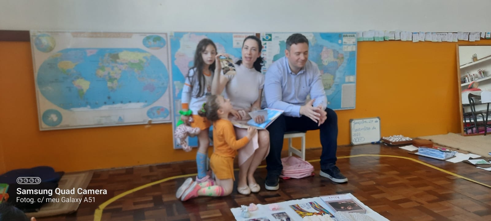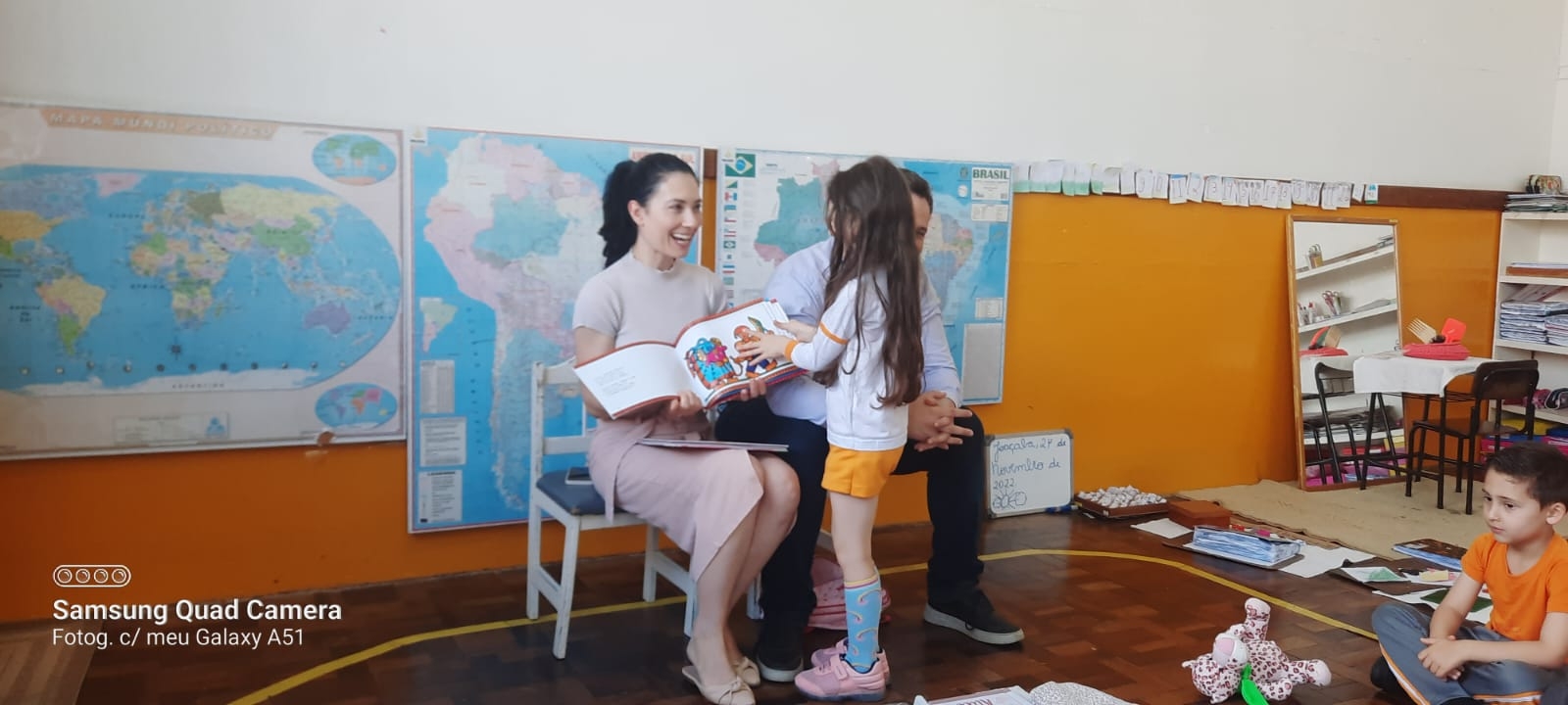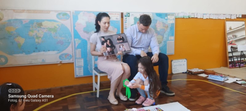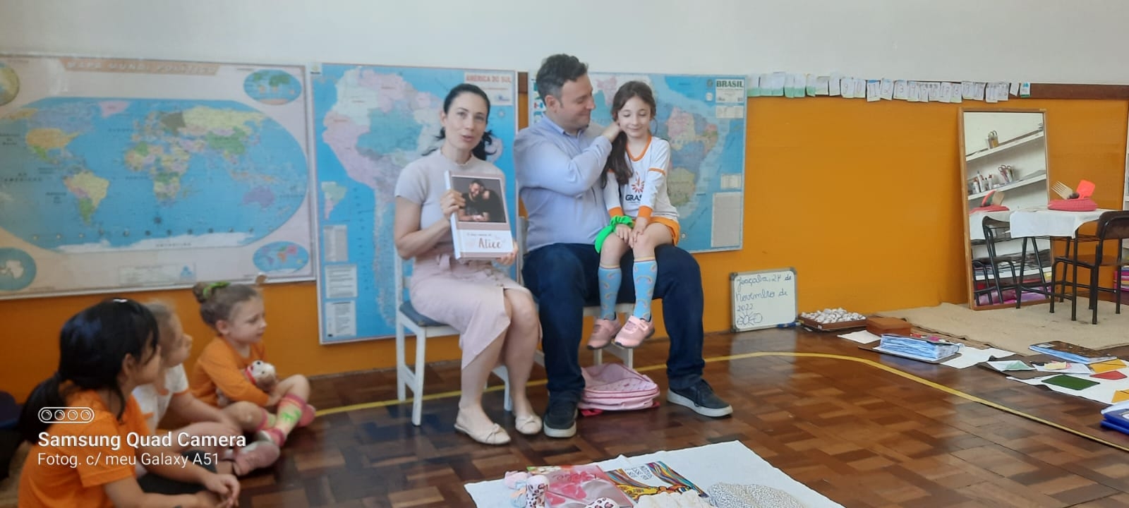 Nossa escola realiza um trabalho intenso em parceria com as famílias. Este ano as turmas das alfabetizações estão fazendo um projeto lindo que traz o papai e a mamãe para dentro da sala de aula. Um dia da semana os papais vêm até a escola para contar um pouquinho da história da vida de seu filho. Desta vez a mamãe e o papai da amiga Alice estiveram contando uma linda história para a turma Quero-Quero. A presença da família cria na memória das crianças momentos de alegria e felicidade, além de orgulho e admiração.