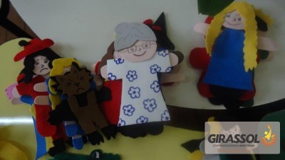 As crianças do 1º ano ouviram as histórias em sala de aula, realizaram pesquisas, leitura e cada aluno escolheu um clássico para confeccionar um avental e contar a história utilizando os personagens.