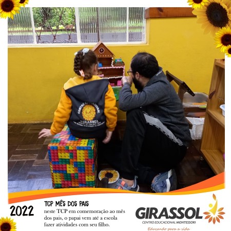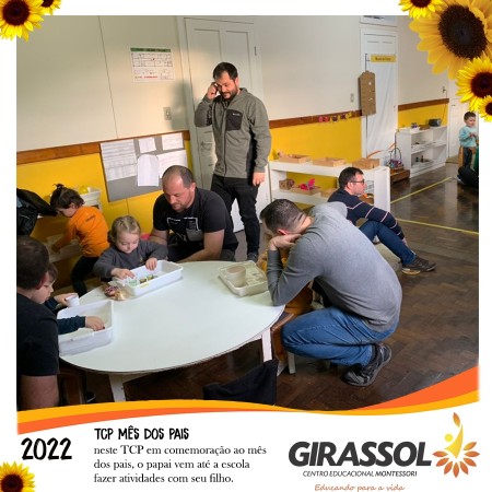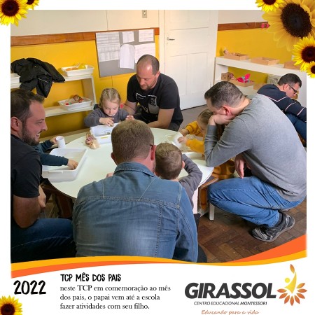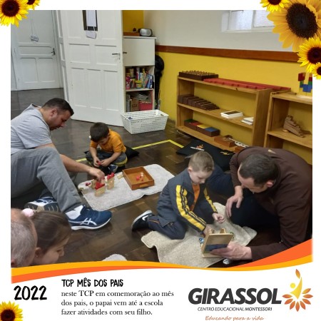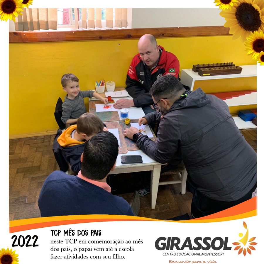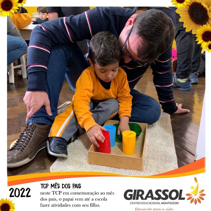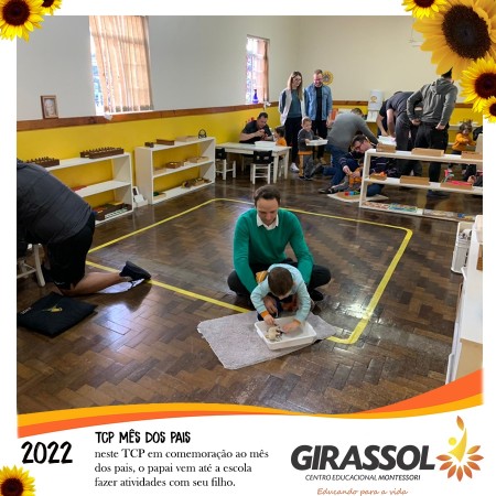 Com o objetivo de proporcionar um momento em família e também para que a família conheça melhor a metodologia Montessori e a rotina da criança em sala de aula nosso segundo TCP (Trabalho Conjunto com Pais) do ano de 2022 foi realizado com enfoque nos papais onde cada pai em homenagem ao seu dia pôde estar com seu filho na sala de aula realizando atividades. A atividade foi pensada com o objetivo de proporcionar um momento especial entre pais e filhos!