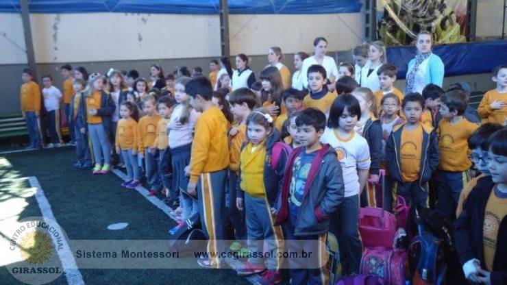 Os alunos do Centro Educacional Girassol se reúnem, semanalmente, para cantar o Hino Nacional Brasileiro, o Hino de ...